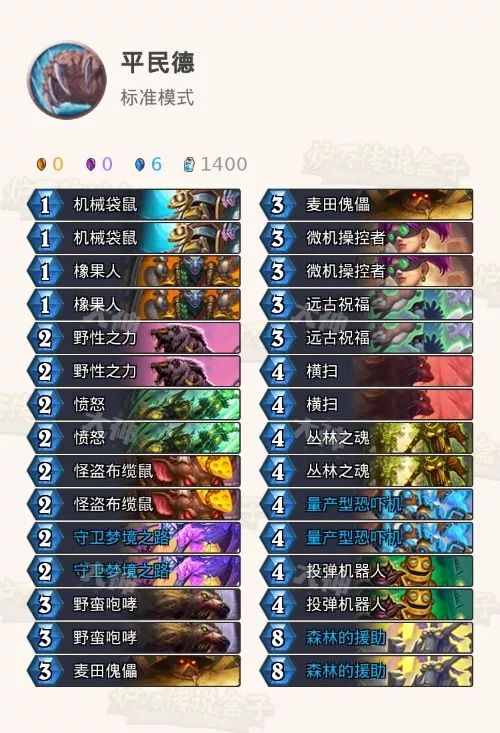 这就是一套简化的机械超生德了,在没有橙卡紫卡的构筑中超生德比其他职业的影响是最少的,因为我们的关键牌都是蓝白卡!这套前期还是和传统超生德一样,机械袋鼠、橡果人、布揽鼠、梦境之路都是必带的卡,能帮助我们快速铺场,而且对手是很难看出我们的形态,等4费我们突然量产磁力一波还有意外的惊喜。这里唯一不同的是我们没有选择带精灵之森、因为环境战士有战路、猎人放狗、低分段盗贼还满编刀扇、精灵的效果实在不理想。换成了投弹机器人更加稳定的铺场节奏!