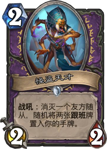这套的构筑是在传统动物园的基础上加入了量产恐吓机、投弹机器人、战争机兵、霜狼督军等等高质量的随从,特别是机械体系占了大多数。这样的好处是中后期我们的爆发能力大大加强了,因为机兵和恐吓机都是能磁力爆发的,所以有一定的斩杀手段。其他方面保留了残酷集结、怪盗天才等牌,甲虫卵、等牺牲COMBO还是得意保留的。