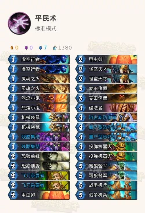 留牌方面比较简单,起手找低费生物快速铺场,烈焰小鬼>虚空行者>机械袋鼠>银色侍从,其他2费可留飞刀、内战可留甲虫卵。