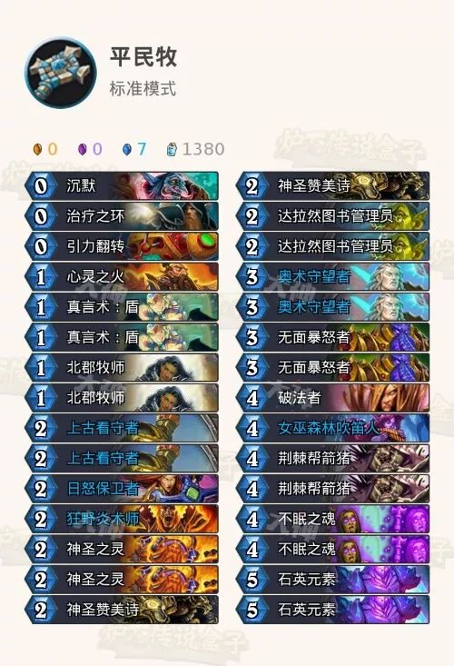 心火牧是牧师中最便宜的一套了,曲线很低,操作打出翻倍效果斩杀也是非常的爽!这个对局全力去找傻子(上古看守者)奥术守卫者、荆棘帮箭猪等牌,这套卡组全是靠随从的质量给压力的。其次有傻子的情况下我们去找沉默(注意起手有才留),达拉然图书管理员也是可留的,我们做的一切都是配合傻子打COMBO,让傻子能动。注意(新手向):这里要注意的是先沉默傻子再给傻子贴BUFF哦,不然场面会一度尴尬!留牌就是刚刚提到的任何对局必留傻子,有傻子去找沉默。