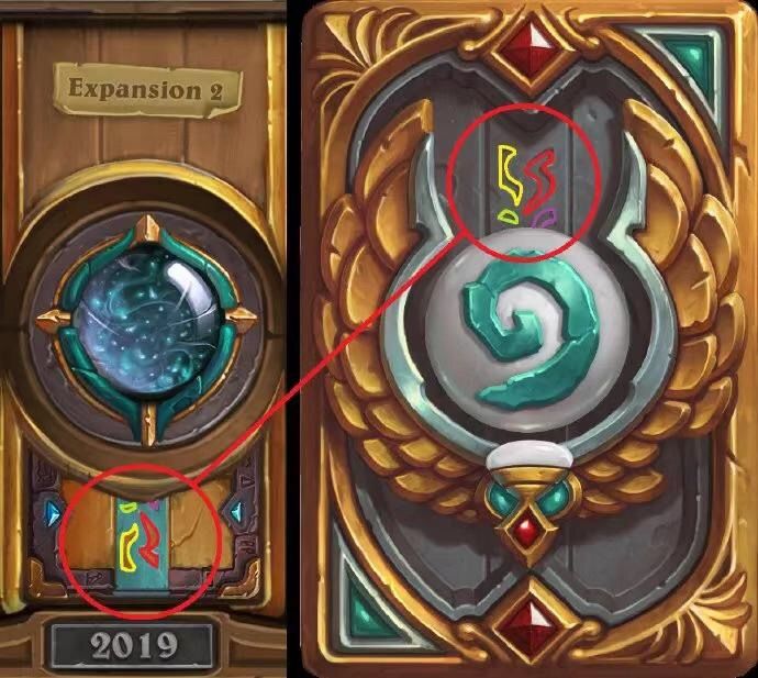 源生法杖这个卡背是完成英雄难度“冒险家协会”冒险模式的奖励,我们可以看到卡背上的远古符号和第二个资料片的图案是一模一样的!