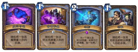 我们可以看到,之前设计师也增加过不少的经典卡,但这些卡大多数还是比较鸡肋,是适应新手向的一些卡牌。随机将恶魔置入手牌是没有构筑倾向的,而且这几个职业的法术都比较相似,术士拿恶魔、法师拿法术、盗贼随机偷牌都属于“玩具卡牌”,也是比较偏向新手考虑的。而冰刺的作用就比较小了,现在也就是奇迹法在刷牌的时候我们会遇到,单独进入构筑是不太可能的。