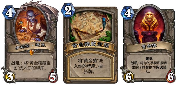 伊莉斯也是那个版本非常经典的传说卡了,一张挖宝几乎称为了全炉石的向往。还记得黄金赛上选手一张牌改变了土豪战,双手举起信仰的那一刻吗?没错,黄金猿是最古老可以将牌库手牌变成传说随从的途径了。虽然传说随从比较不稳定,但是快乐是一定的,这就是当时暴雪把娱乐和强度完美结合的一张橙卡,虽然我们可能被传说随从坑死,但也可能被传说随从救场,总之一张金橙伊莉斯会让我们哪怕上一局被坑了,也毫不犹豫的再次使用!现在版本虽然有拉法姆等牌可以快捷的让牌库变成传说随从,但伊莉斯作为狂野的中立,还是深受很多玩家喜爱的!