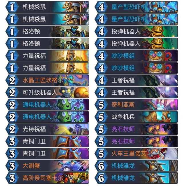 这套机械buff骑也是乘着"机械崛起"的东风强势崛起,不仅实战效果奇佳,而且性能强大,亮石技师的加入使得这套卡组中期的质量可以呈爆炸式增长。水晶工匠搭配光铸祝福以及奇利亚斯可以保证自身的血线,由于光铸祝福属于双生法术,所以小编只带了一张,这套卡组的核心思路就是buff贴上然后抢血。在面对牧师、法师以及萨满这类职业时,一定要记住分散投资,因为这种带有沉默,变形法术的职业是磁力的天敌,而面对战士术士这样的职业时就可以只站场一两个随从,毕竟这两个职业群解较多,可以防止吃到扭曲虚空以及绝命乱斗这样的卡而直接崩盘。