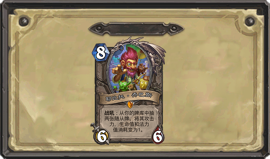 耶比托·乔巴斯从最早的蓝龙猎用来过1费的温雷萨和大蓝龙,配合一堆低费法术斩杀对手。同时在机械克苏恩战和控制萨等卡组中,都能用来过一些高费战吼强大的随从,可以说这张卡牌在很多整体费用偏高的中后期卡组中,都能发挥不错的作用。