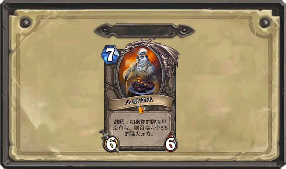 刚开始被认为是一张“废材”随从,但是,从最早的诺米贼、糯米牧这两个既能够快速过牌,又能多次复制诺米的职业,很多卡组都被他们飞速过空牌库后的3波6个6/6的随从踢死。甚至防战都带上了法强生物配合战路用于2个乱斗消耗过后来清理最后一波诺米的铺场。直到现在,有些战士也带上了诺米,在抽完牌库后,同样来一波诺米的铺场,打对手一个措手不及。大厨诺米算是新版本中一张风光无限的中立橙卡。