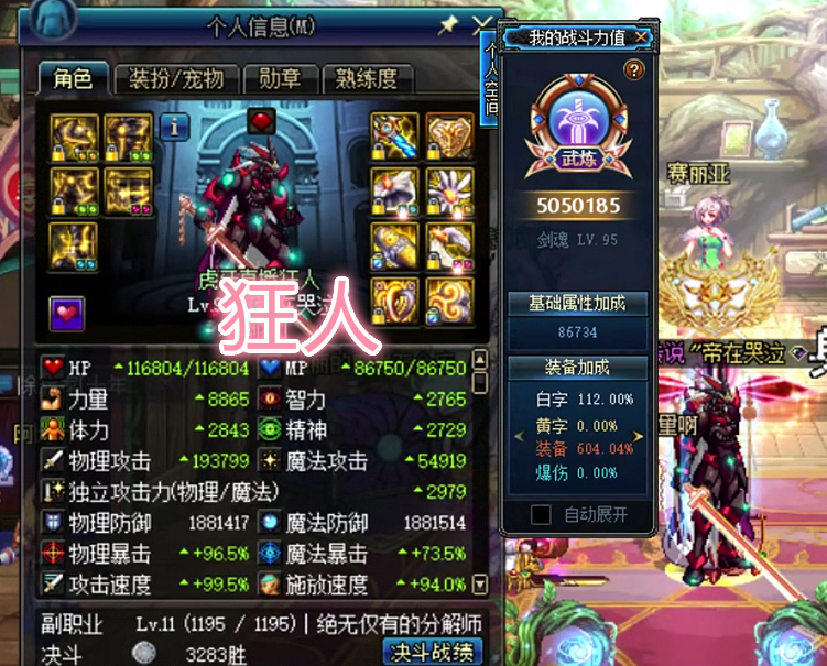 狂人的剑魂,在装备打造上,比旭旭宝宝少一件红17,不过,因是百分比职业,战斗力就显得较高。在超5轻甲下,剑魂505万的武炼战斗力,比旭旭宝宝红眼都高。
