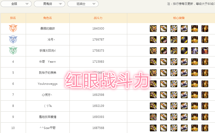 但在全服战斗力排行榜上,男鬼剑狂战士中,旭旭宝宝不是第一,且连前十都未曾挤进去。可以见到,第一名的红眼是184万武炼战斗力,跟旭旭宝宝相比,差距还是非常大的。旭旭宝宝作为400万战斗力的红眼,按理说应该排在第一才对,却并没有他的身影。