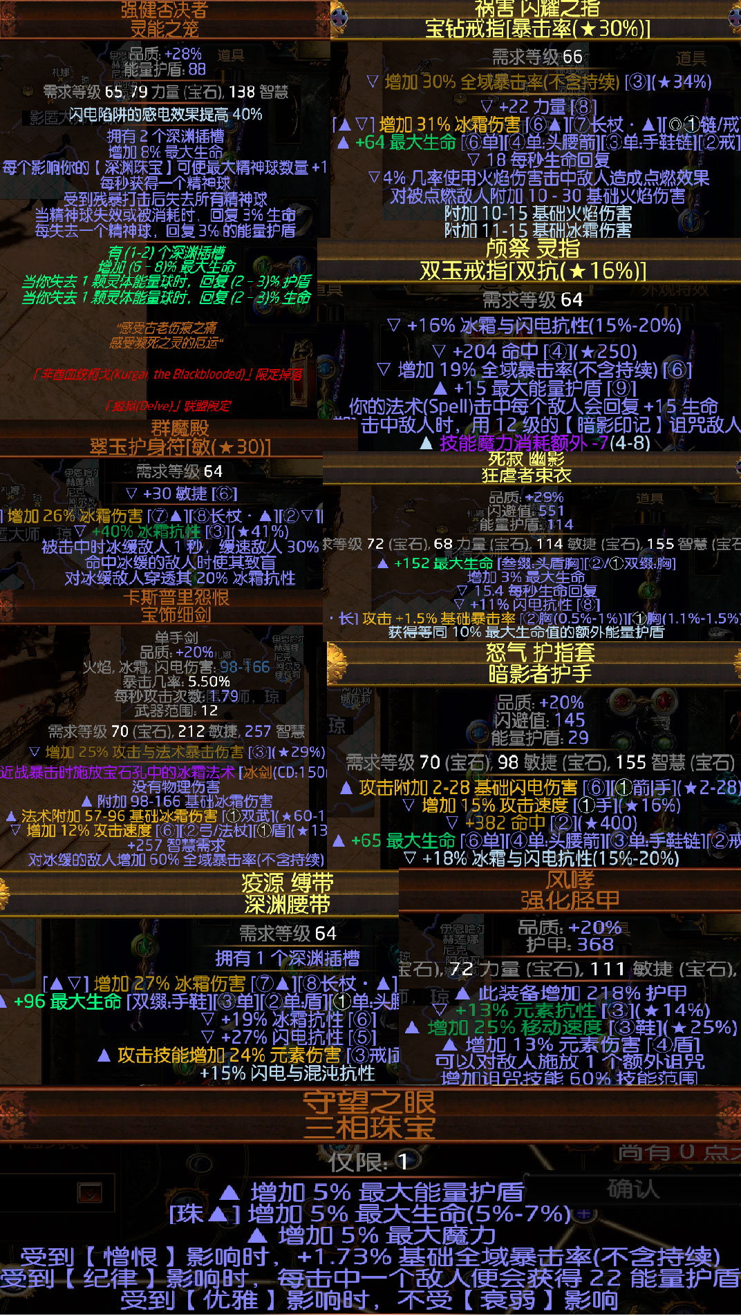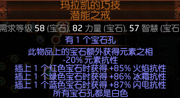 如果用火系,一个戒指的位置可以换成马哥的巧计(集市卖1c),里面放纯净之捷,能获得元素之相50%减火抗。原理是召唤物受到憎恨光环影响获得额外冰伤,用冰伤触发减火抗电抗。攻坚伤害更高。还有火系下极地吐息的冰缓地面也有冰缓效果的,这个冰缓效果也能让冰剑的全域暴击率生效。如果怪物同时被冰缓和点燃,就会变绿。此时药侠就会变成绿王,把小怪从T1绿到T18。