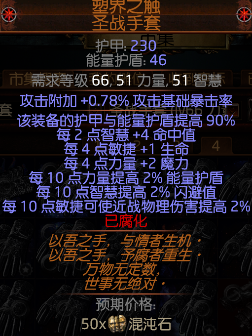 胸甲建议选择长老智力敏捷底子(最好86物等),这样比较好洗孔色,装备具体洗法分时期。过渡期间洗法:完美点出高品质,然后直接用混沌洗,洗出好词缀且留有一个前缀位置的情况下就留着,再附魔一个10%生命额外护盾。后期洗法:先用完美化石点出高品质,然后用改造洗出T1生命+T1攻击暴击率,上富豪,好属性就留着,否则就剥离,如果剥离失败了就重新改造洗。最后上多大师,附魔10%生命额外护盾,+1诅咒(如果有的话),剩下1个属性根据自己的需求附魔。本赛季不推荐用狼牙+原始化石的方法洗了,一是因为贵,二是因为化石出好词缀的概率降低了。