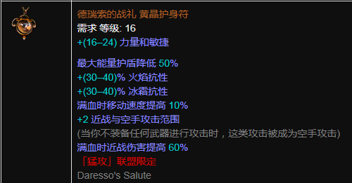 选择比较多,我自己用的是海玉护身符基底的,野生的,生命抗性优先。顺带重提,旋风斩极度缺智力,如果装备智力撑不上,天赋点只能多走两个加智力的点了。
