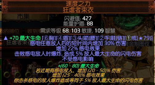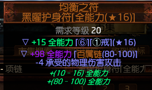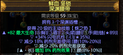 腰带:前缀最大生命 后缀减少药剂充能使用。可带一闪电或者冰霜抗性。没有也没有关系可以用戒指去调整。其他属性暂时不需要管他。空一前缀附魔药剂效果即可。腰带买的10C。蜘蛛光环自己附魔的。