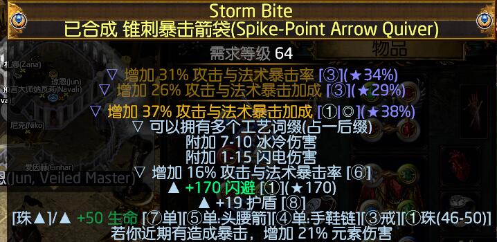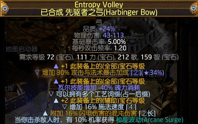 然后最终版是选择弓+箭袋的选择,这个我没有太多通货去做,所以选择自己做了+1 30爆伤上缀的弓,然后剥离等方式做出这把弓。上缀的话比+1 +1的弓稍微低了点伤害,1%左右,但是造价低了太多