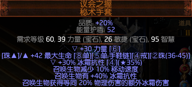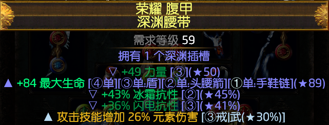 深渊腰带,如果有召唤生物生命最好,没有也行,最大生命,力量最好有,这样生命就可以堆的很高,其他补抗就行
