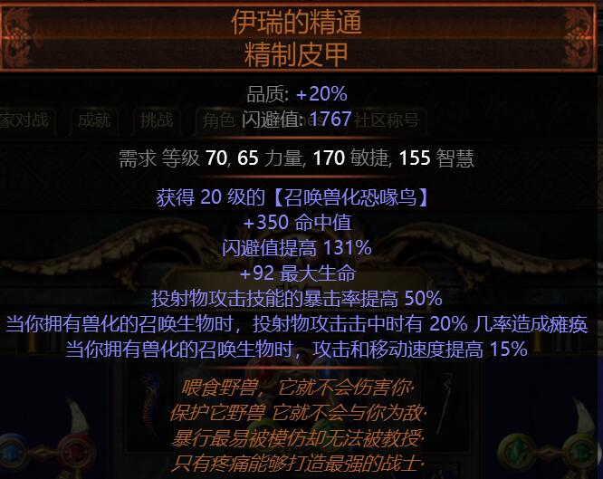 俗称鸟衣,议会衣,苍白议会掉落,6连一般3-4e,命中生命暴击攻速,全是我们需要的属性,关键是这个召唤技能也会被放在衣服上的coc(暴击时施放)技能石触发,完全自动召唤