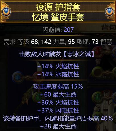 120C市集淘的手套,然后直接附魔了个28生命~手套首选属性为高攻速及生命,其他则是抗性按实际情况取舍