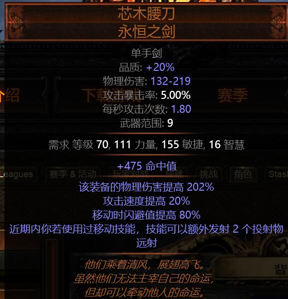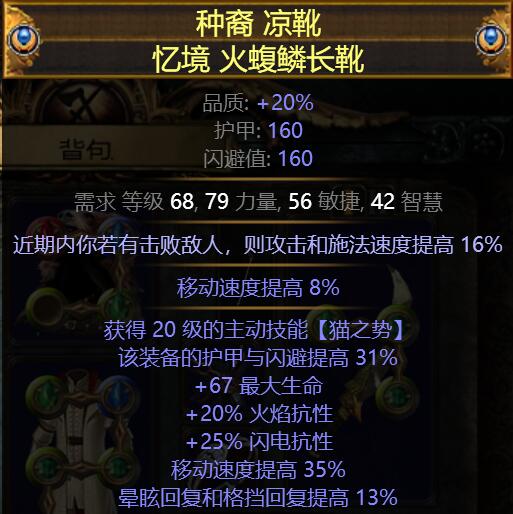 这鞋子吧,其实8%移速基底不重要,也可以选择异色鞋,看行按自己抗性要求,重点属性为高移速,生命及抗性(忽略上面的猫之势,之前测试留下的废词缀)