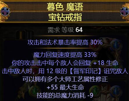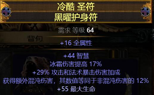市集买的60-100C忘了,附魔了个生命就带着用了,重点属性为爆伤和额外混沌伤害最好有暴击率,因为低配版缺暴击的。其他可追求生命/攻速/冰霜伤害等等相关加成词缀