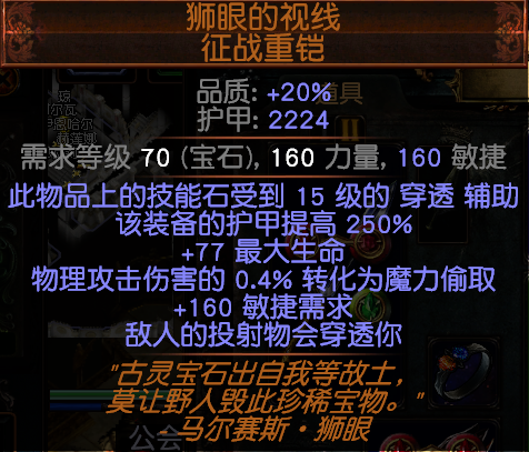 胸甲用狮眼的视线自带穿透属性,对刷图效率提升巨大,大量的护甲和0.4%偷魔也非常合适BD。选择高生命高护甲即可。或者选用高护甲高生命6l即可。可绑定。