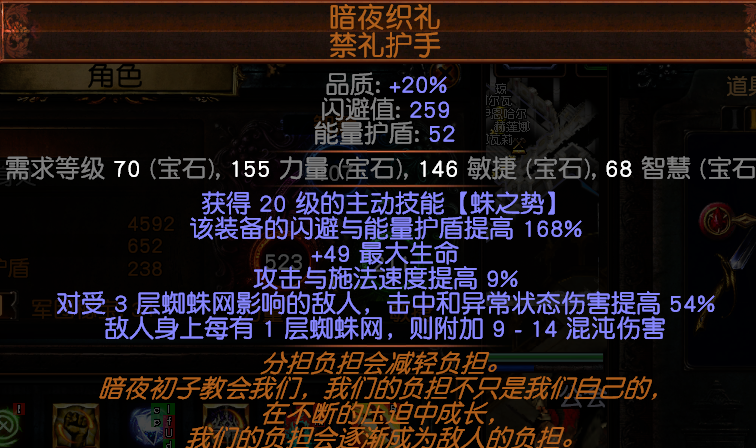 手套选用暗夜织礼,俗称蛛网手,手套提供生命,攻速,60%伤害和15%more,非常契合BD,建议绑定。