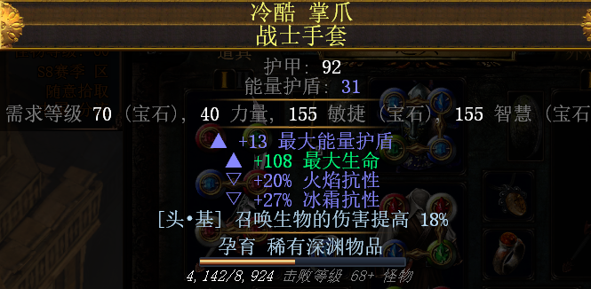 手套:T1最大生命+抗性。留个前缀附魔生物伤害
