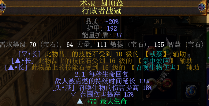 头盔:长老底子,7L头盔。献祭+召唤生物伤害+集中效应。还要能附魔生命或者自带生命。越高越好。