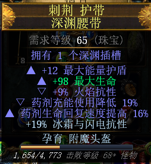 腰带:深渊腰带,T1最大生命+药剂充能使用降低16%-20%,搭配天赋魔法学和腰带、总消耗达到51%即可,其余也是补抗性跟带力量最好。