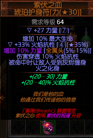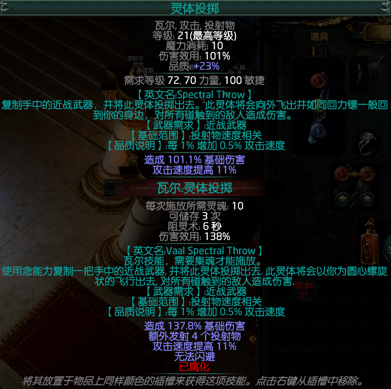 上面的三张图片,分别是核心绑定的2件装备和输出技能,请各位先用心看看先,首先,我先讲下火神锻台,这把武器一直都是我最喜欢的武器,没有之一,高额双点伤加成,高额暴击几率加成,双持接近500%的暴击几率加成,什么概念,搭配天赋暴击点我现在站街75%的暴击率,还是没有带增加暴击率的辅助宝石的,搭配火之化身,可以让我们的输出技能变为100%物理伤害转火焰伤害,而且这把武器相当高产量,高产量=便宜,不用担心被抄,3.5我发的2个火神锻台BD,黑商只坚持1个星期,价格就从2E降回20C,至于攻速和武器范围的弊端,我个人认为是完全可以忍耐的,10-20C的武器有伪镜子装的属性还想怎么样咧,但是,我还是把这2个问题解决了,暴徒高攻速加成和灵投无视武器攻击范围,完美解决这武器的弊端。然后讲下索伏之血,提供火之化身,火焰穿透,百分比力量和生命,还给敌人附加灰烬缠身(20more火焰伤害加成),完美契合火神锻台,目前还不算贵,有可能被抄,但是没关系,下面天赋点法,我专门点了一套索伏被炒起来的点法。最后来讲一下灵体投掷,我们的核心输出技能,我们用的是瓦尔灵体投掷,瓦尔灵投可以给我们提供很高的爆发伤害,瓦尔灵投、狂怒、零点投射可以达到300-400Wdps的秒伤。灵投的技能标签只有投射物和攻击,意味着他本身能吃到的辅助宝石加成是很少的,元素类和近战类的高额伤害加成辅助技能宝石是完全吃不到的,但是火神锻台搭配火之化身,可以让灵投达到100%的物理伤害转为火焰伤害,这就使得灵投可以吃到火焰伤害加成的辅助技能宝石加成了,而且灵投是远程技能,可以穿透所有怪物,完美弥补了火神锻台武器攻击范围太小的问题。