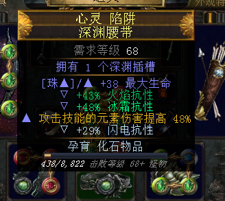 深渊腰带,缺抗就生命+抗性+元素伤,有钱可以追求3伤的腰带,提升还不错