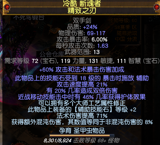 衣服:绑定T18掉落的永恒幽影,血色之衣,必须额外元素的混沌伤害必须5%。该BD为物理伤害转元素,获得多次混沌附加后巨额的混沌伤害,也是上赛季常说的星空人BD。