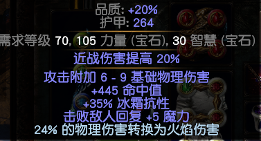 辅助技能石选择:因为不是纯物理伤害,所以没办法用版本热门穿刺。因为转了元素,请不要选择物理伤害提高字眼的辅助!请选择总伤害增加字眼的辅助石头,多重打击必备!穿透不是必备,有其他手段获取穿透!