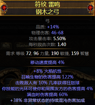用绑缚+以太+原始洗出召唤生物伤害和满血伤害,再根据实际情况优先附魔非异常状态混沌伤,再或者多大师+2辅助技能宝石,还有下缀可根据自己需要附魔自动施法或者防御(自施法可以让操作更加方便,没有也无所谓)(吐槽一下,我这弓本来是还有条上缀想附魔+1所有技能石的,锁了无法ROLL出攻击词缀,上崇高后才想到这是把塑界弓真是尴尬。。。。还好狂怒球其实也不错,几乎常驻4球16%MORE)