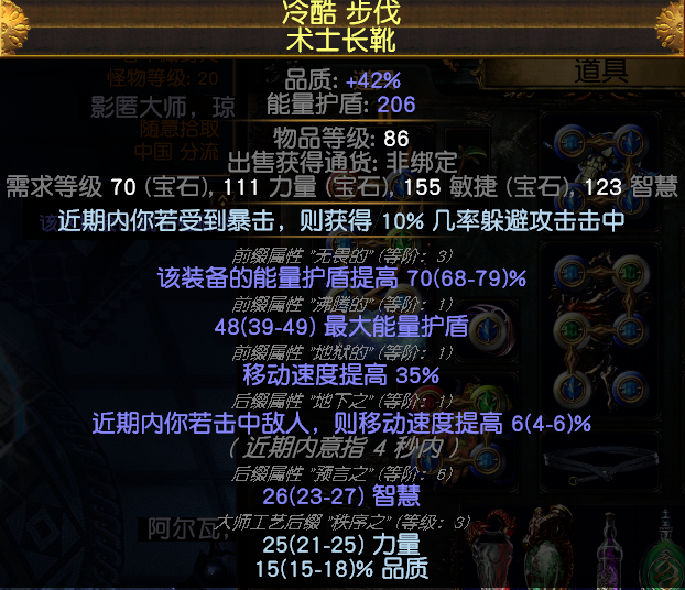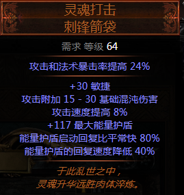 手套优先裂界底子用化石洗高护盾+16%非异常混沌伤优先,我用致密+畸变+以太(减少大量点伤词缀)洗很难洗,到目前没洗出能看的,而且非异常混沌伤很难出,推荐意境加最大能量护盾底子术士手套直接追求高能量护盾好了。
