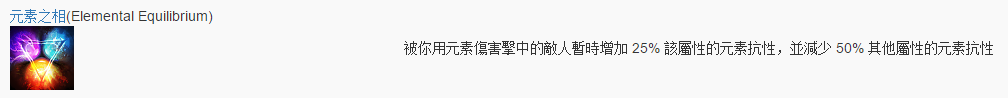 打个比方,当你使用火焰伤害攻击敌人时,4秒内增加怪物25%火焰抗性,降低50%冰霜、闪电抗性。核心增伤天赋,也是由M神提供的思路,跟这把剑的契合度比较高,当随机一种元素伤害的时候,下一次随机的元素伤害会吃到这个减50%抗性的效果,依次循环下去。