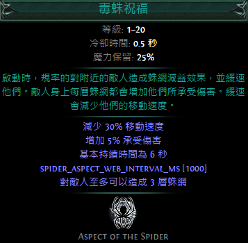 每0.5秒对敌人释放一层蜘蛛网,最多叠加3层,每层增加敌人5%的承受伤害,最高15%承受伤害,1.5秒即可叠满,攻速和法术通吃。一个被忽略的势光环,占用一条戒指和项链的后缀,25%魔力保留,不可以被启蒙辅助,配合冠军20%承受+手套威吓10%更多,可以达到一个45%更多伤害的效果。很多BD都可以选择这个光环来增伤