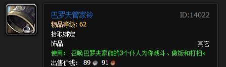 怀旧服之后的通灵学院副本进行了改版所以这件装备也随之绝版,装备作为巴罗夫家族的遗产,可以随机召唤出来的3个仆人将为你战斗、做饭和打扫。每次召唤出来的仆人的种族都不一样但是仆人的战斗力却是惊人的,3个55级以上的仆人将会全力殴打你的敌人直到对方死亡或者逃跑。10分钟的冷却可以确保自己在野外PK的胜利,也可以在战场中提升团队战斗实力,很长一段时间国服玩家PK都会带上这件装备。