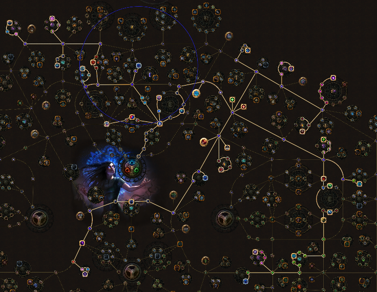 天赋的几点说明:(1)途中蓝圈处是插了潜能防护(生命转护盾)从而能获取将近1000的盾量,同时也方便点生命大点左边的盾牌盾量和法伤的天赋;(2)出生点附近的奥数意志(加魔法上限,获得4%的魔法盾量)最好是要点出来,不然刷图带着一个蓝瓶很难受;(3)中间最上面精纯之潮天赋最好也要点出来,提供点数护盾,护盾恢复速率和提前回盾;(4)如果力量和敏捷足够,完全可以不点那两个+30属性的天赋,不过最好还是点一下吧;(5)优先点出+1诅咒和护盾大点,之后补非异常持续混沌伤和少量法伤;(6)由于是低血BD,因此伤害非常高(相比上个版本的异能之体玩法,能多开一个光环,低血30%更多法伤,虚无之塔的减抗和凋零姿态的大量增伤,输出远远超过上个赛季),很强大。