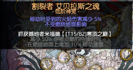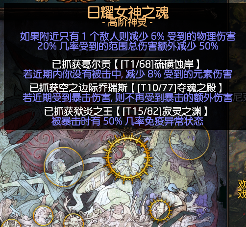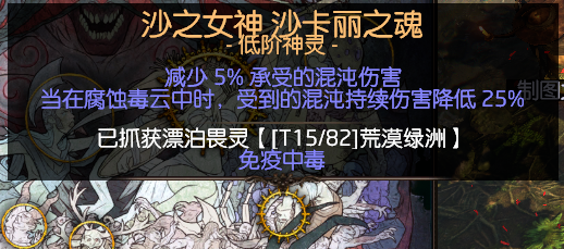 万神殿尽早抓齐,尤其是免疫中毒很重要,如果地图词缀有燃烧地面且没有怪物击中中毒词缀,我们则可以用免疫燃烧地面的小神(非挑战党不用抓副神):