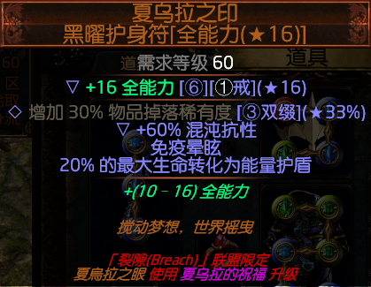 风哮(这个翻译明显是错别字吧喂!注意要用升级版的)提供了+1咒和60%的诅咒范围,可以更换成高护盾高移速高抗性的术士长靴;