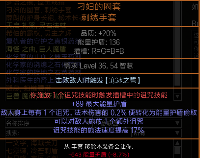 刁妇的圈套,混沌之毒必备的装备,绑定,尽量选择护盾高的,施法速度个人实测不是那么的重要,15%+的即可(有的游戏截图就是上传不了,很奇怪)。