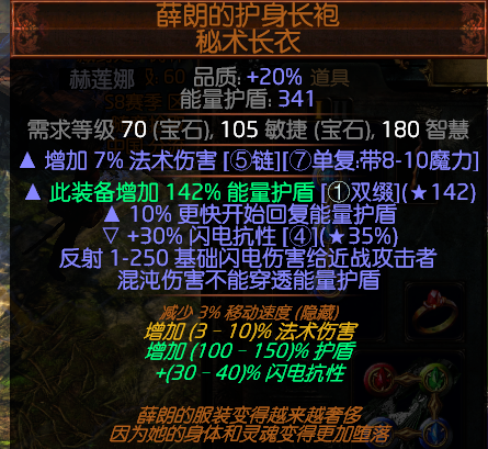 其中薛朗衣提供了混沌伤害不能穿透能量护盾,可以说是ES流的核心中的核心;升过级的夏乌拉项链提供了免晕、大量的混沌抗性(从防御面板可以看出我们角色的混沌抗已经溢出)和20%的血转盾;梦语之痕可能有些朋友不是很清楚为何也是绑定,是因为冰冻和晕眩一样,是以最大生命为基础门槛,由于血量很低所以如果不免疫的话那么基本上你被冰冷攻击击中被冻结的概率很大很大,而且戒指也提供了大量的冰抗、魔力和魔力回复速度,大大缓解魔法恢复较慢的缺点,尽量不要去瓦。