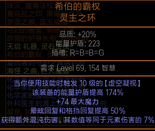 议会头可以更换成高护盾高抗的灵主之环,议会头自带的虚空凝视可以减敌人20%的混沌抗性,配合诅咒+升华的-20%抗以及凋零姿态,能极大提升敌人受到的混沌伤害,并且议会头的虚空凝视可以对传送门和图腾生效,打T18的时候极大提升输出能力;