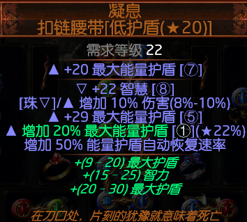 凝息腰带不建议更换成星空底子的水晶腰带,因为薛朗衣本身的盾量很低,即使有了从胸甲获得额外能量护盾的词缀收益也不是非常大(而且非常昂贵),而且凝息腰带有50%的能量护盾自动回复速率,这很重要,如果实在是缺抗的话可以考虑更换。