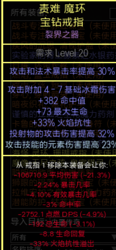 由于元打珠宝转伤被砍,另一个戒指不用燃焰或意志呼唤,收益不如加较多inc伤的黄戒指。我入手这个就很适合,血+抗+命中+爆率+投射物伤+附魔元素伤,100c入手。有废词缀,也还有提升空间。