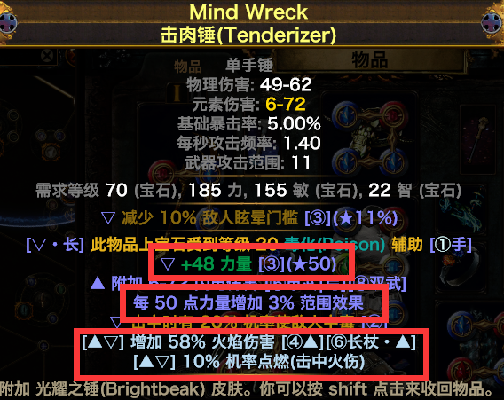 1)使用长老底子的单手锤,洗出50力量加3%范围,同时最好附带高力量,附魔火焰伤害