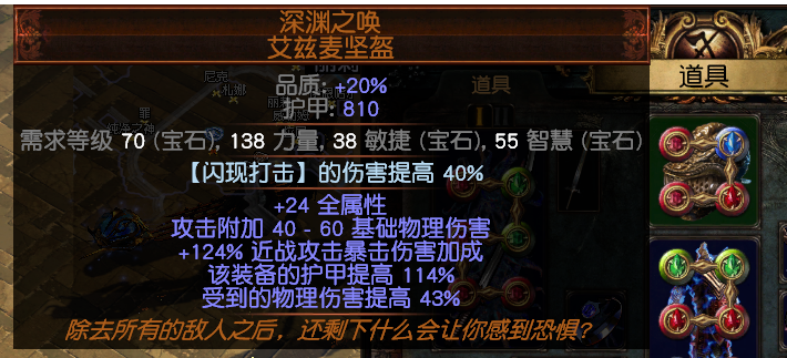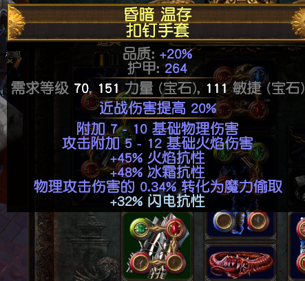 手套:直接找一个扣钉就可以,补抗性,前缀生命和物理点伤最好有一个,最完美的是前缀生命,物理点,附魔一个偷取时伤害提高43%,后缀补抗性。自己看着找。