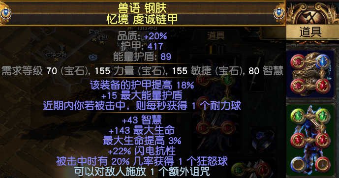 胸甲:胸甲可以自己做,我用的忆境遗产,多了一条受伤得红球提高生存,但是衣服的重点是用化石点一个20%受伤得绿球,是一条重要的得球手段,直接洗一个高血得球衣服附魔一个额外诅咒就可以,没有额外诅咒也可以,不是必须。而且衣服不需要六连,不需要六连!!