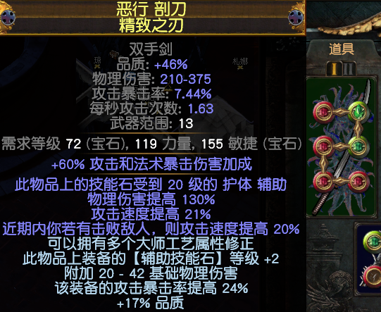 武器:武器精致之刃,改造洗护体,多大师就可以。后缀附魔攻速也是21%,裂界的攻速在打18的时候没用,这个武器跟多大师的武器是一样的。