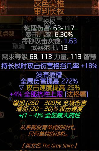 2. 武器:暗金长杖,灰色尖椎,审判长杖,价格在30C左右吧。这个貌似没用人,但是效果还可以,大量的全局伤害,+4全抗,没有插槽在这个BD中不是太大问题。或者换成其它双持高伤害法杖,这块主要看自己的造价,可高可低。