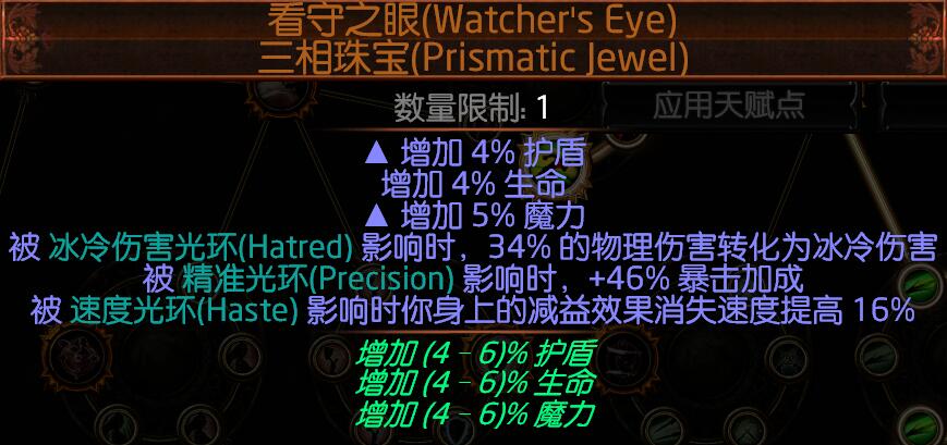 这里要给萌新说明一下,因为天赋和装备好多增加冰冷伤害和穿透冰冷抗性,所以珠宝最好别堆特别火和电的点伤。那样面板虚高实际输出低。